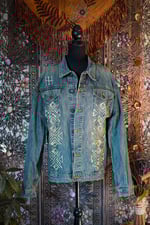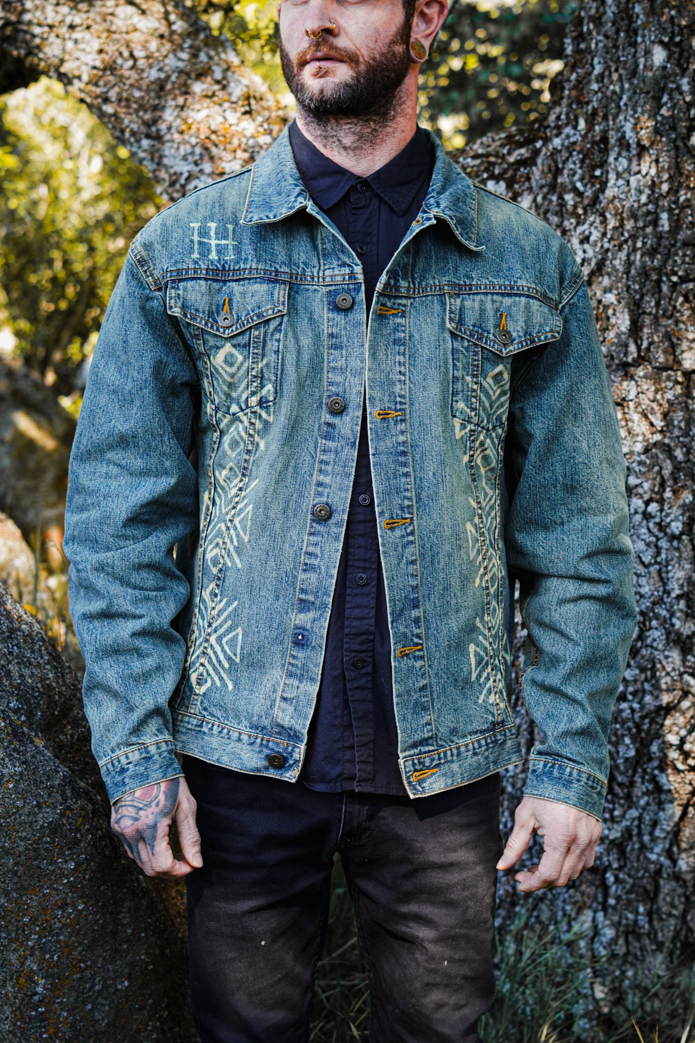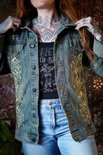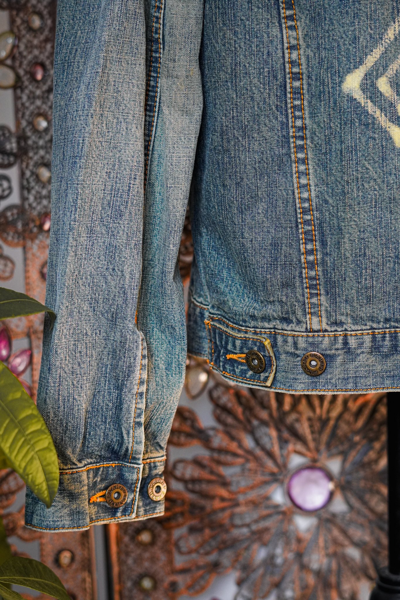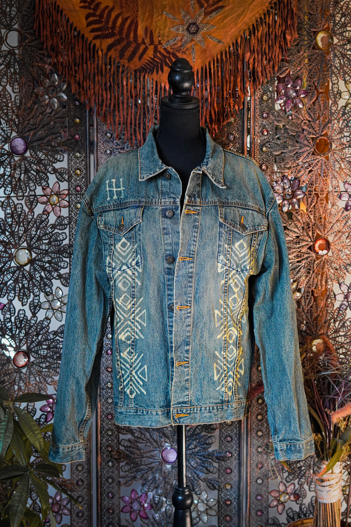 Original design printed on an upcycled selvage, vintage washed indigo denim jacket. This is made as a one-of-a-kind piece. Custom tapered waist for a trim fit. Metal tack button closures down the front, on the sleeves, and bottom edges for adjusting your desired fit and style. Two front chest pockets are featured on the front of this jacket. Made out of a high quality thick denim, built to last!